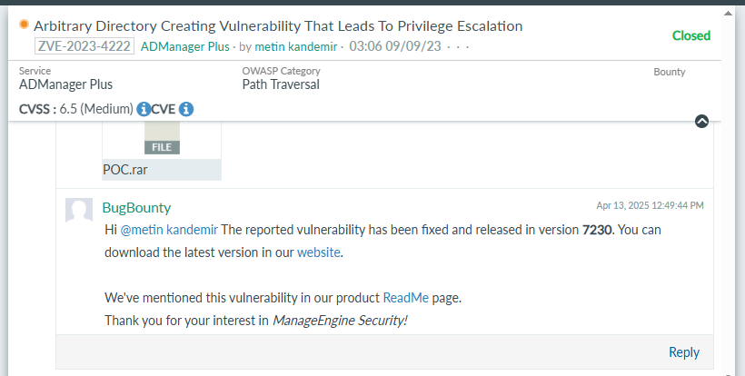# ADManager Plus Build < 7230 Elevation Of Privilege Vulnerability (CVE-2025-9435)